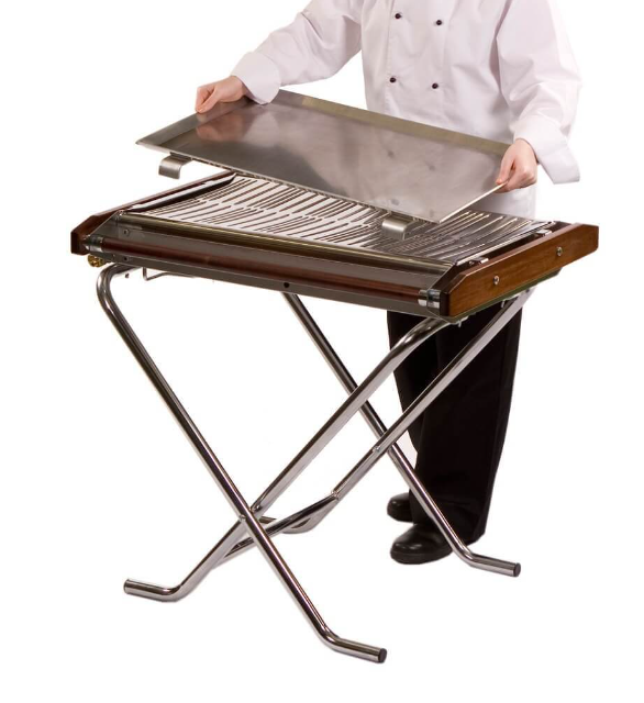 PRACTICAL FEATURES INCLUDE: ( Gas not included ) No assembly needed. Leg design remains stable on soft earth, also protects controls when folded. Cooking heat achieved in less than five minutes. High pressure burner unaffected by wind. Internal self-cleaning by reflected heat, -means no time lost. Excess fat collected in any disposable ring-pull can. Folds to 215mm (8½ins) flat for convenient transport and storage. Easy low maintenance from minimal, rugged design. (11kg Gas Will Last 7 Hours Max) Portable Dimensions - 44” (1120mm) x 26” (660mm) x 8.5” (215mm) Working Dimensions - 40.75” (910mm) x 26” (660mm) x 33.5” (850mm)
