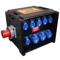 Ideal for larger marquees run on generators 60KVA. Inlet: 63A / 415v Panel mounted inlet (IP67). Outlets: 6 x 16A / 240v (2 per Phase) & 3 x 32A /240v (1 per phase) Panel mounted sockets (IP44). Protection: 1 x 63A / 30mA RCD (inlet), 6 x 16A MCB & 3 x 32A MCB (1 per socket). Dimensions: W: 400mm / 510mm with Inlet D: 350mm H: 340mm. Weight: 10.7kg