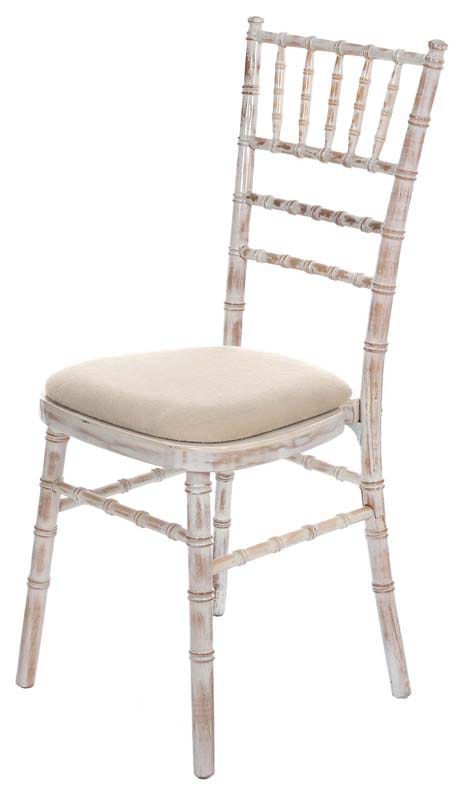 These beautiful limewash chivari chairs look great with our selection of round tables and are ideal for weddings, parties and functions. The chivari chair is arguably today’s most popular wedding and banqueting chair, it lends itself perfectly to the antique finish. Please advise what colour seat pads are required for these chairs. (With a choice of seat pad colours - ivory & white incur a small additional cleaning charge).